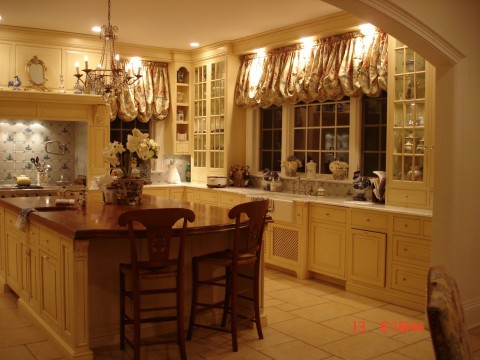My beautiful pale yellow kitchen with teak topped island (carerra countertops)