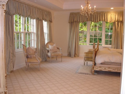 My wonderful ?bedroom done in the palest celadon and pale taupe (Fabrics are from Beacon Hill and Scalamandre)