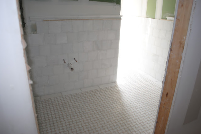 Guest room bath almost done, still wet so thats why it appears gray but its actually white Thassos