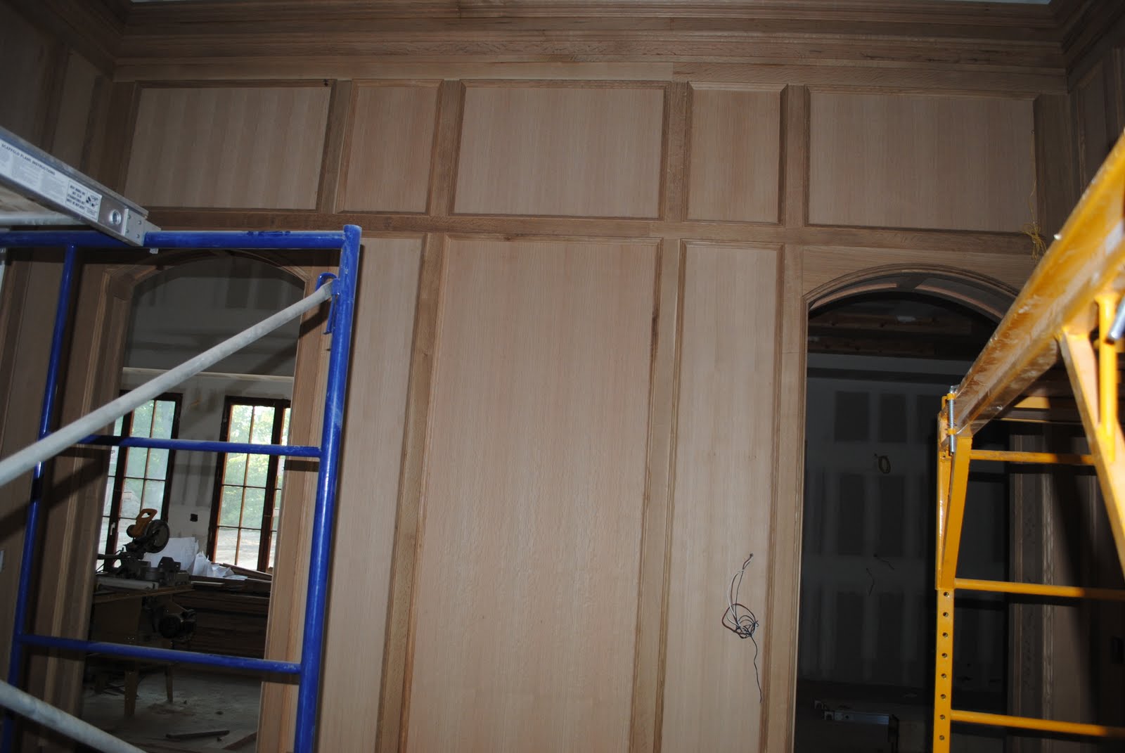 HOUSE UPDATES. The foyer floor is nearly done…just love the way it came out. We used a honed French limestone, a very quiet clean limestone with black stone “dots” and border. I think it came out beautifully. The wood floors are done upstairs, that’s a major accomplishment as is most of the trim on the second floor. The plumbing has started to get installed in the upstairs bathrooms so upstairs we really truly are down to the end, we even had the carpet installer come to take measurements so I could order carpeting and we spoke to a few painters. Downstairs things continue to move along but the finishing?involved downstairs will take much longer, however the breakfast room paneling is near done, now we have to work on various stain samples, so below are some pictures of recent updates.