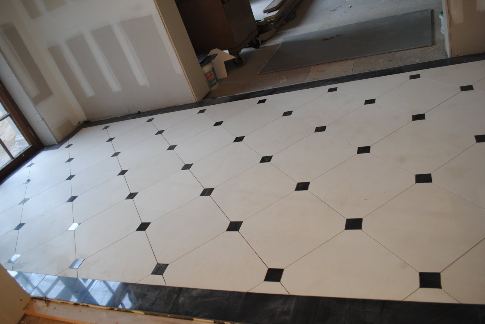The cabochon floor pattern in the entry looks fabulous. We used this pattern in our last house (white marble with black marble in-dots) and wide black marble thresholds under the archways leading into adjoining rooms.