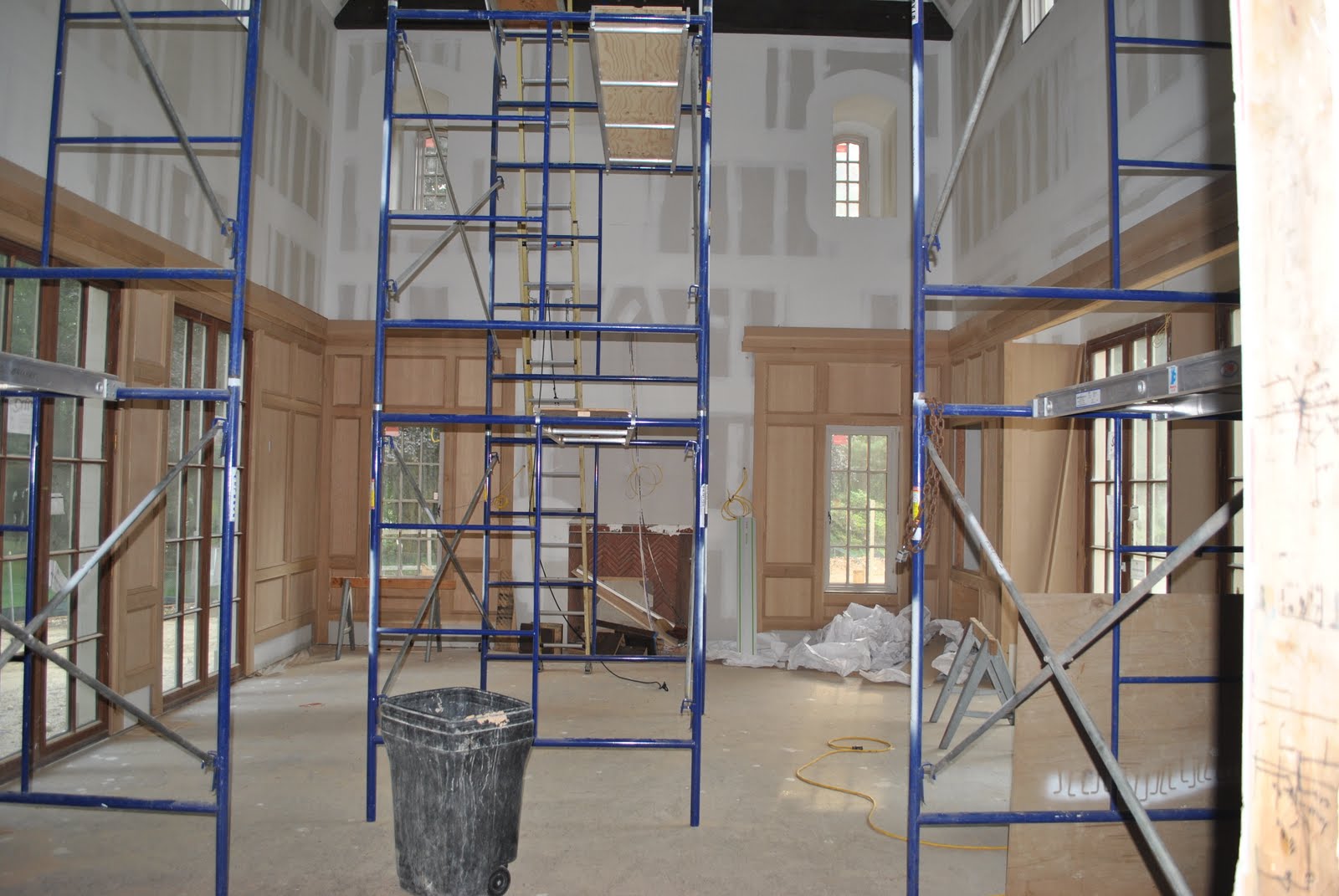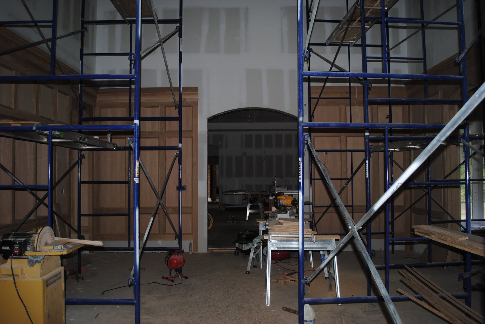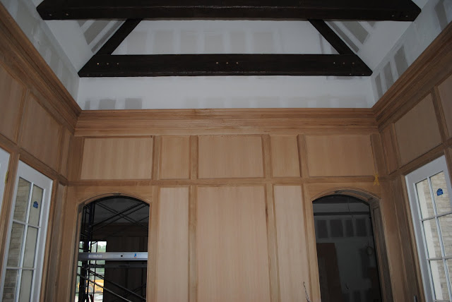 HOUSE UPDATES. So this week they are finishing up all the trim upstairs (and with the exception of my master) all other bedrooms and hallways are done! Started putting in plumbing fixtures into bathrooms and we got our first trickle of real running water…a thrill!! Floors in library are nearly done, family room paneling is well underway, breakfast room is basically done but the baseboards. They just finished the beams for kitchen and now are staining them, planning to put them up next Friday! Painter has started, limestone arrived for covered porch, so plenty going on…..I will let the pictures do the talking!