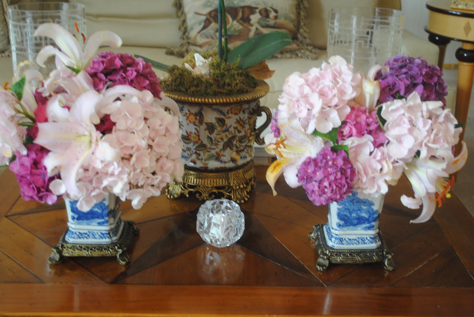 FLOWER ARRANGEMENTS FROM MY VERY OWN YARD. This time of year, all kinds of things are blooming. I can always rely on my trusty old friend, the ever so hardy and consistent hydrangea to provide me with countless small arrangements to place throughout the house. One day after a bouquet of flowers I had received had “expired’ I put the lily plant outside, not thinking twice…..well suddenly that “dead plant” from a year ago surprises me one morning with a huge stalk just chock full of gorgeous lilies!! What a nice surprise! So I took some of those lilies and made up a few small arrangements with the hydrangeas and put them in my little trusty blue and whites (best $20 I ever spent) and I am quite happy with the result. Professional flower arranger I am not, but enthusiastic, willing learner and experimenter I am!