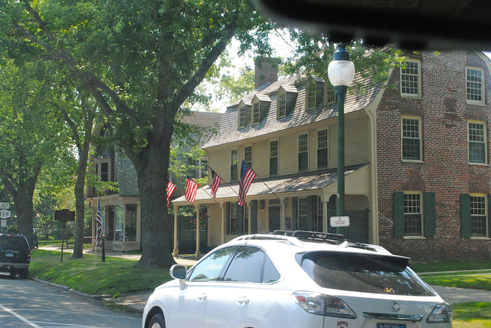 Charming building in East Hampton laden with American flags