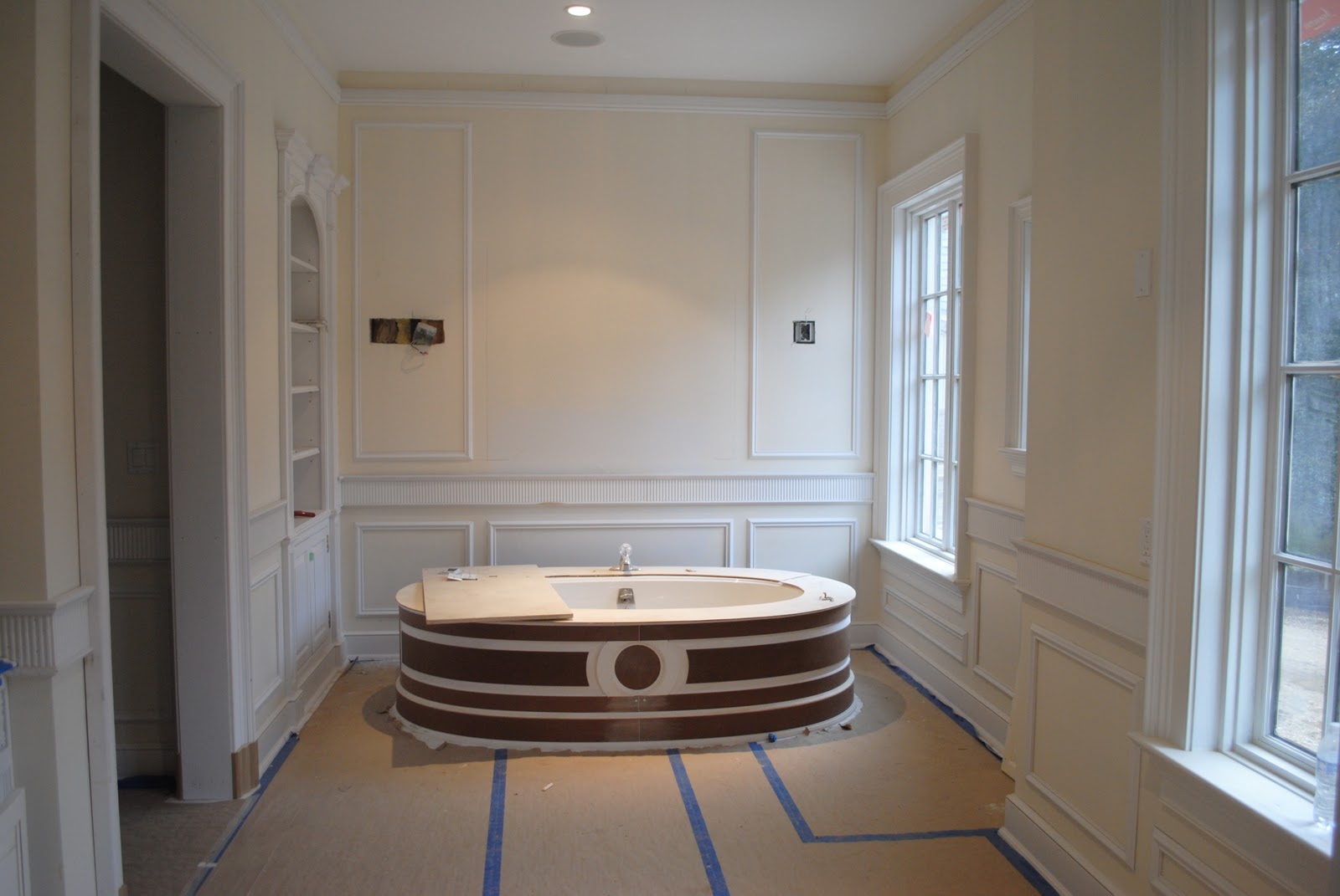 Tina- Well, it is really moving along now-starting to shape up and be a home rather than a house being built! Love the detailing in the bathroom….the reeding under the chair rail…the wood work on the tub surround. It is all just perfect.