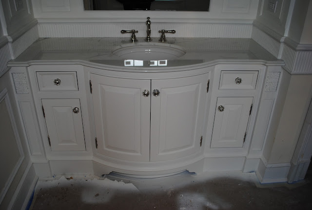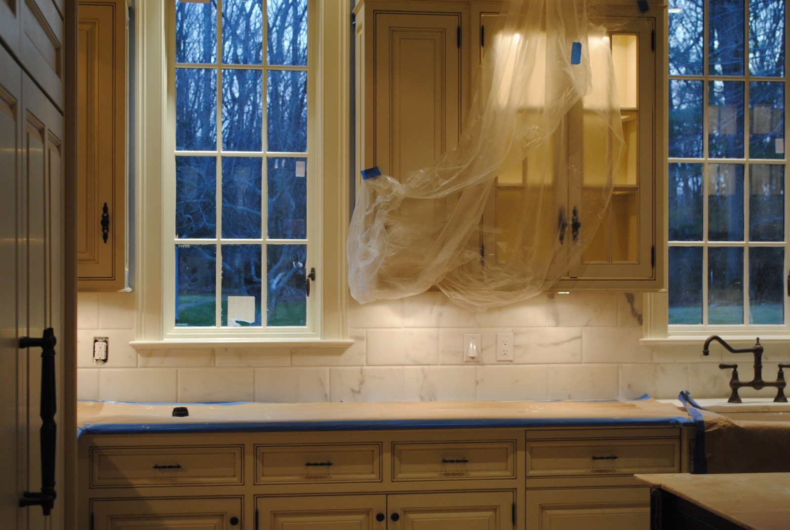 HOUSE UPDATES. Lots of finishing touches this week, biggest excitement for me was my kitchen backsplash. If there is one thing I learned during this process it is to listen to your instincts, and I am so very glad I did!!. Most were saying they werent’ sure about the oversized subway and finding it was not an easy task then finding it beveled proved to be beyond challenging. Well I stuck it out and finally found it and I was doing backflips over the finished product. LOVE the backsplash, only part not yet done is behind the range, the chair rails came in wrong, so now waiting on the new ones and then will complete the back of the range and then folks, its bring in the range, get some lanterns and we are nearly done!! Woo hoo! Painting continues downstairs, and other little odds and ends, here’s the lo down. Front entrance is back to being worked on again (they were waiting for copper flashing), porch is just about done, and came out beautiful, I know we are really going to enjoy spending time there. Some hardware got put on and mirrors put in.  Sure enough my camera died when I was about 3/4 done with my photo session!!