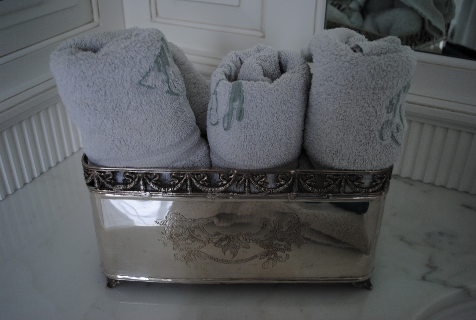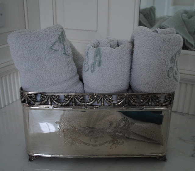 In my bathroom love having my monogrammed towels rolled and placed in this gorgeous silver planter…