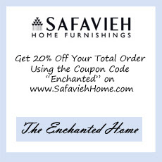 Finally saving the best for last….a little “prize” for each of you! Safavieh has graciously decided to offer all of The Enchanted Home’s readers a special limited time 20% discount off of any item they sell! This is beyond generous and a great way to take advantage of their already incredibly low prices on the most magnificent furniture, accessories, lighting and rugs! The code is “Enchanted” when checking out. THANK YOU SAFAVIEH! Click here to visit their site (warning it will keep you busy for hours)!!
