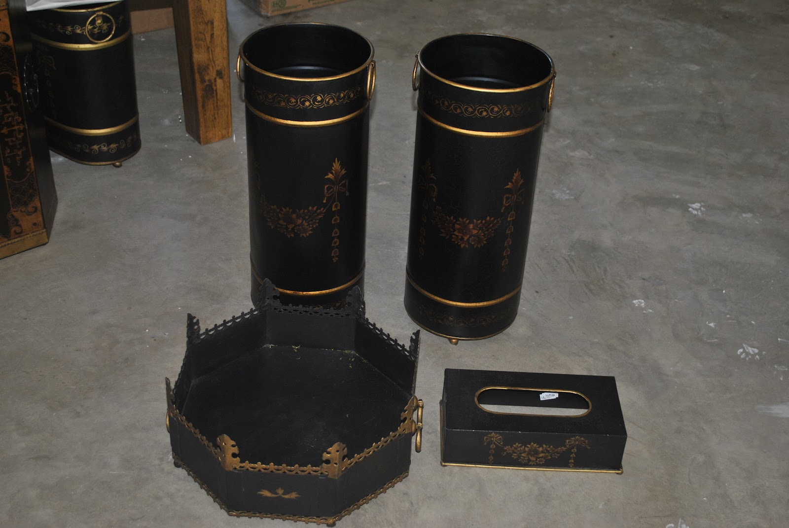 Picture 3 Got a few more black tole chinoiserie pieces, two gorgeous garland umbrella stands, one more crown planter and garland tissue box