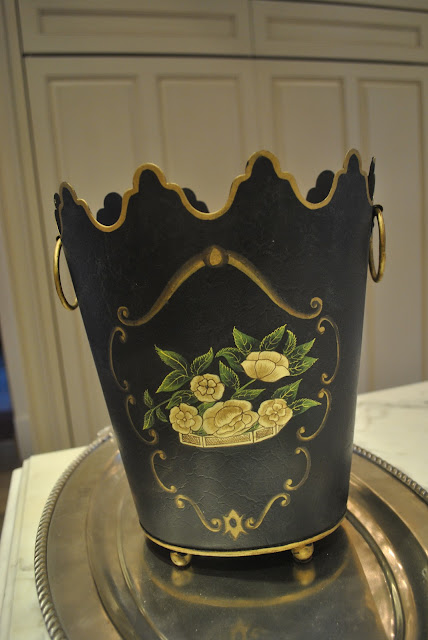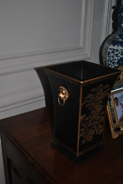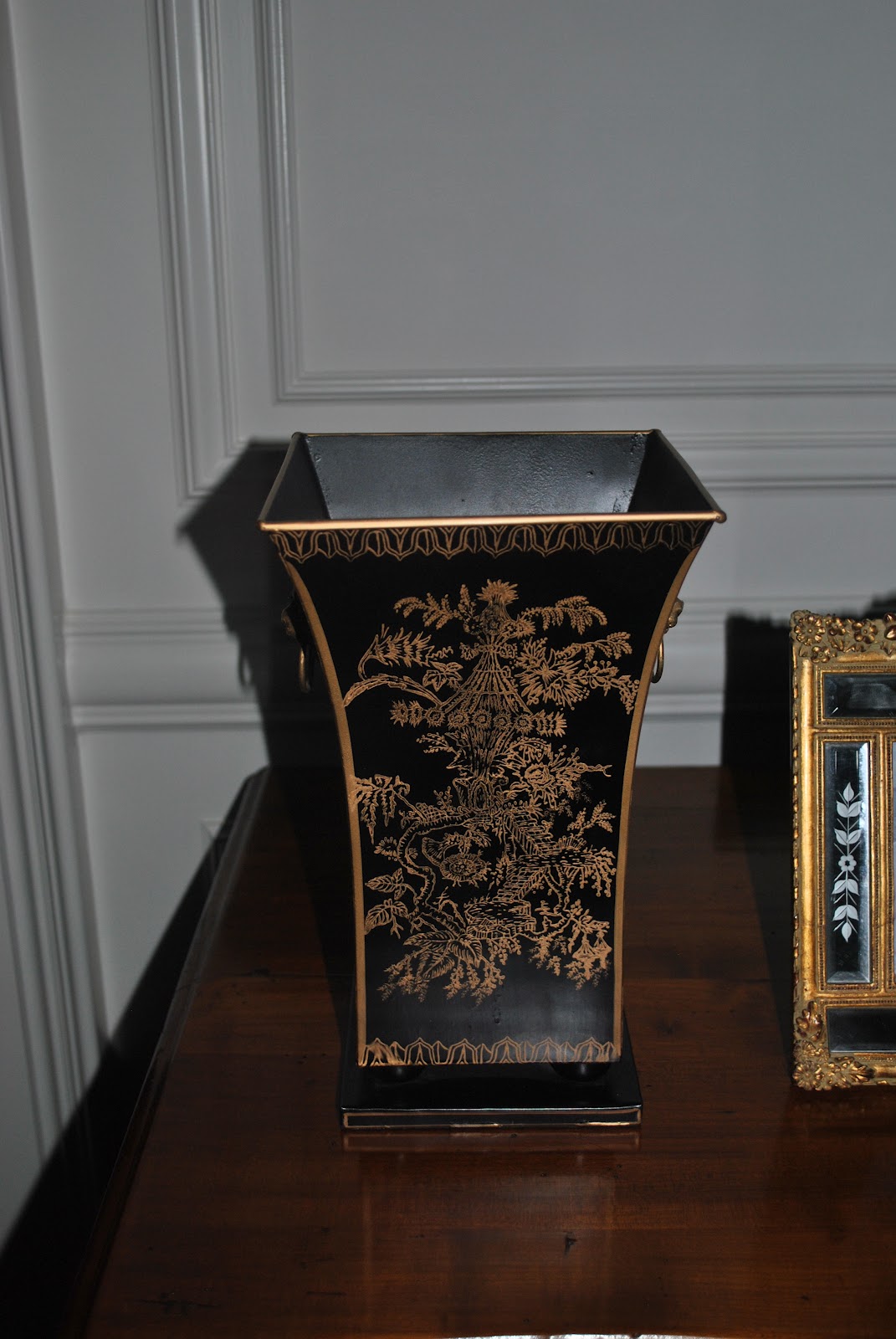 Picture 17 Stunning blk tole planter or small wastebasket, I have 6 of these…love the gold rimmed scallop detailing