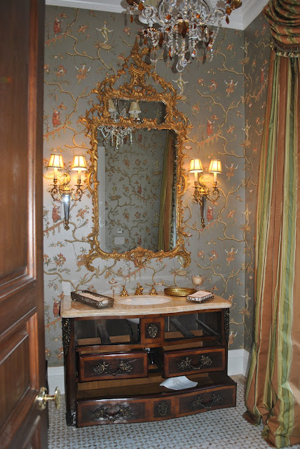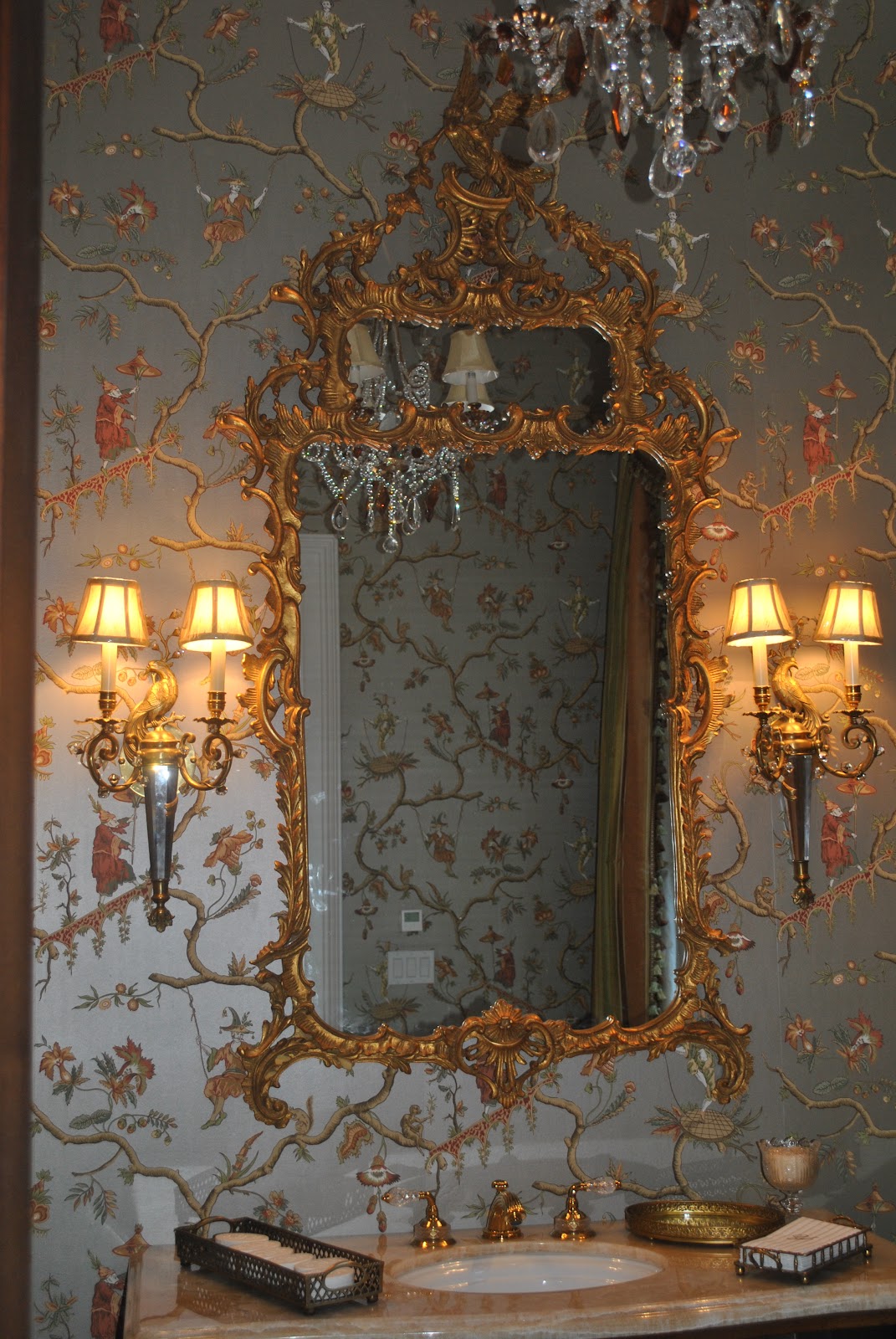 Then to my main powder room…got the gorgeous mirror up with the new chandelier and I must say I am madly in love…..remember I am going for a jewel box super elegant formal vibe here. (The reason the drawers are not closed is because I am waitin for my handyman who is coming today to cut out the back to fit under the sink)