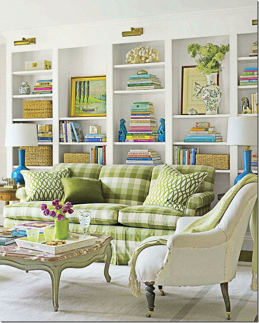 Meg Braff used a green buffalo check in this gorgeous living room in fresh green.
