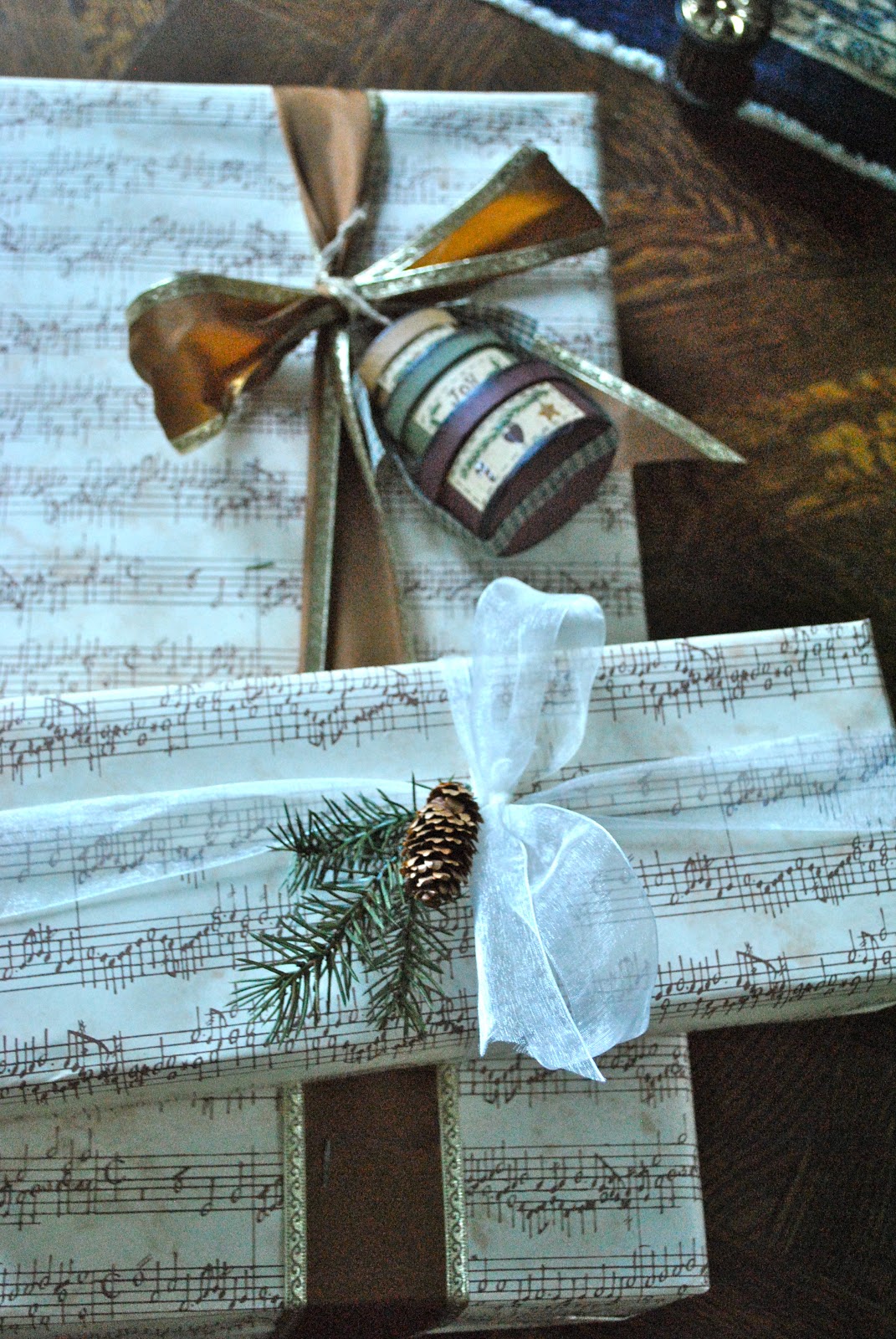 Wrapped my first two Christmas gifts, here they are. I always pick up all kinds of litlte doo dads to add to gifts to make them feel special. Granted, I have a looooong way to go and many gifts yet to even purchase but this is one step in the right direction.