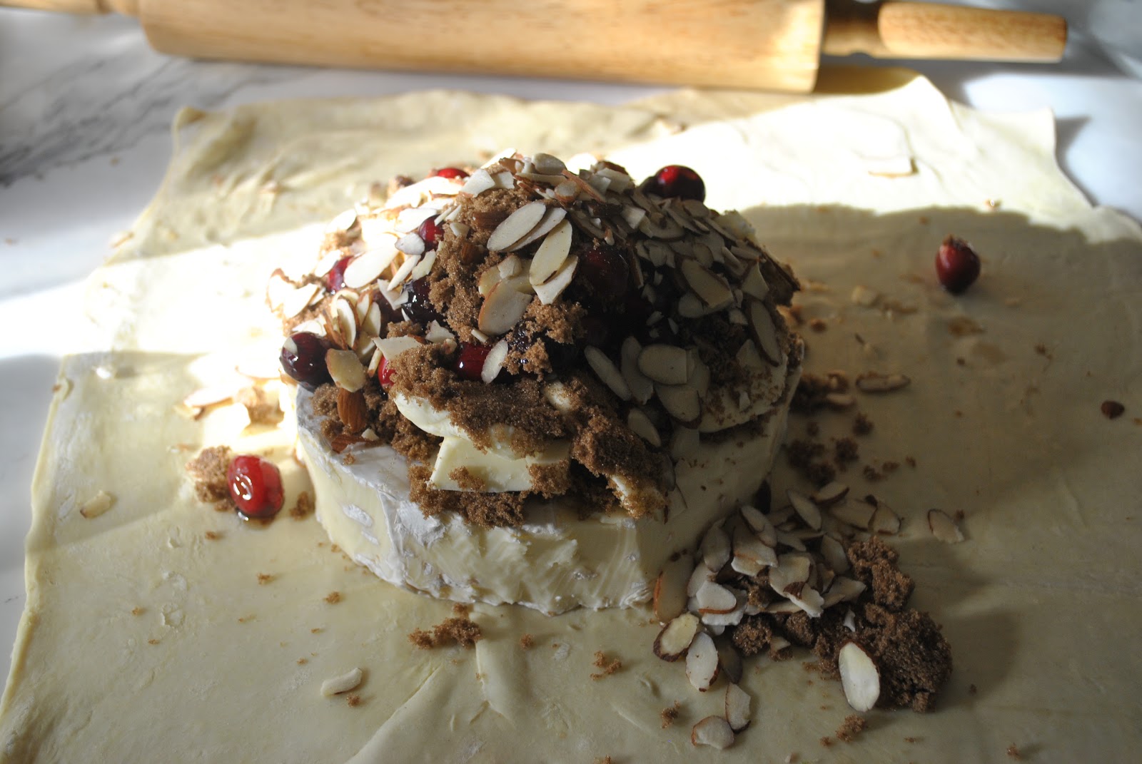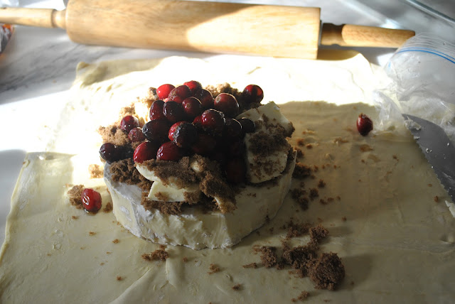 Put cranberries in a ziploc and add maple syrup, shake bag so all are covered, ideally they marinate over night. Next morning roll them or shake them in a ziploc with sugar…..Cut the rind off of the cheese, let dough sit at room temp, roll it out with ample flour until you have plenty to wrap around the cheese. Add cranberries, cut butter, nuts and then top with brown sugar on top of cheese, then “wrap” the dough around and twist on top. Brush on the egg whites to seal the dough. Bake into a pre heated oven at 350- 375 for approx. 25-30 minutes. As soon as it is golden brown take it out, you can cover with aluminum foil and serve about 15 minutes later. If keeping in oven, turn oven off and tightly wrap with aluminum. I garnish with fresh cranberries. I serve with Carrs water crackers,