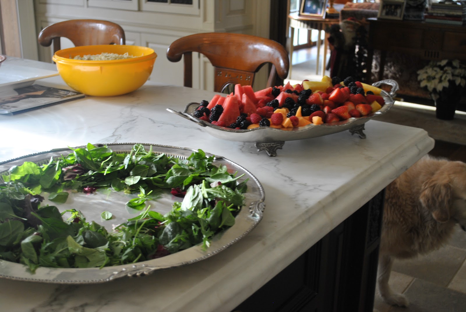 Big round tray for fish and large fruit platter going into the fridge, Teddy “standing guard” for any remnants that might hit the floor…