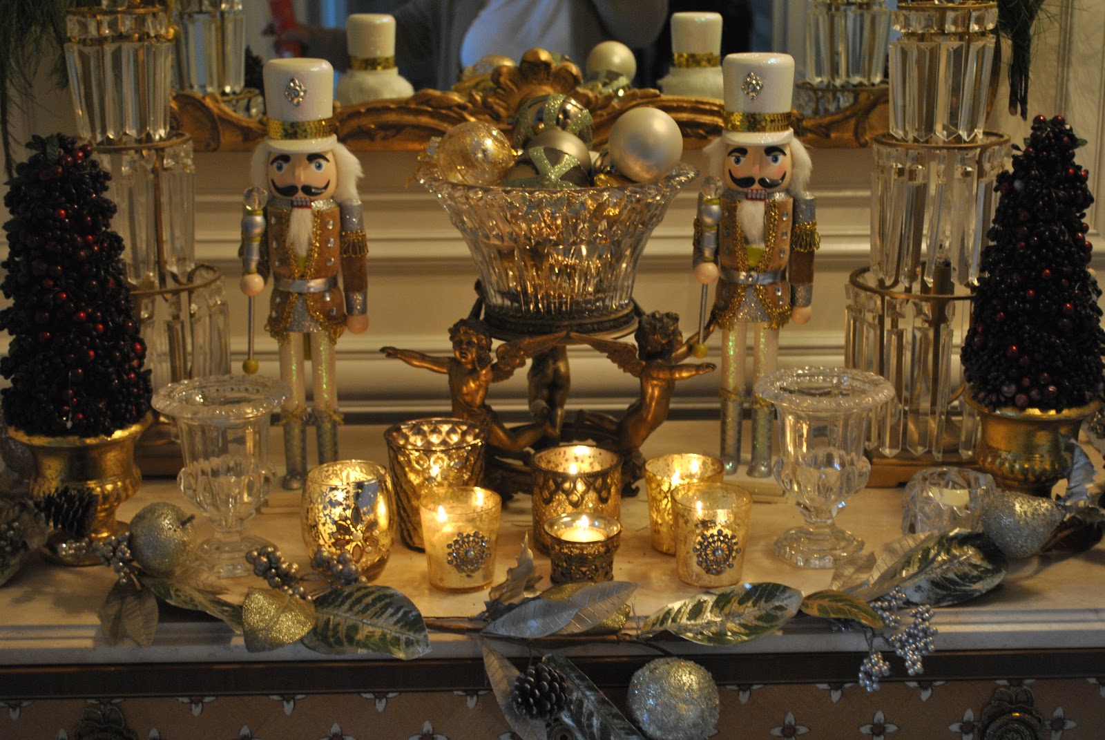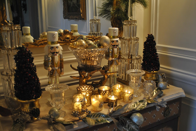 My “bling-y” nutcracker vignette all aglow in gold and silver………….