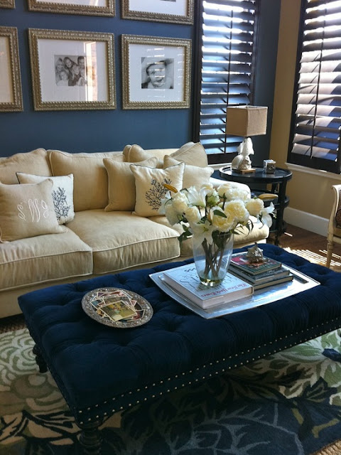 By the way, I am in love with the deep blue walls in the picture with the dark blue studded ottoman and floral rug. Is there ANY way we can find out what color paint that is???