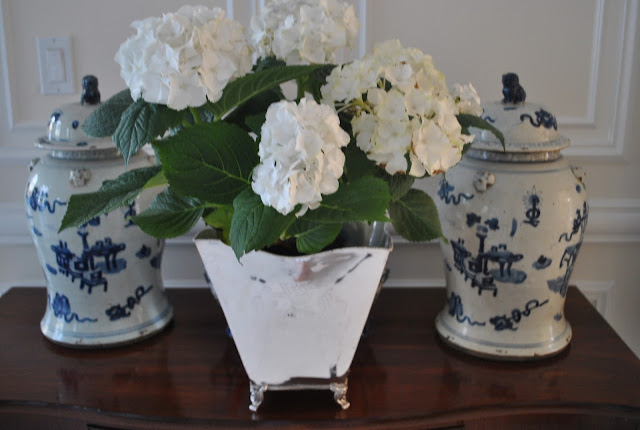 Gorgeous Roman shades in the kitchen Tina! The new silver and blue and white is so pretty and I always enjoy seeing you fill each piece with flowers. The faux, fresh mix is the way to go! Glad you are back and sounds like a productive trip. I’d be exhausted! I’ll bet you will enjoy a quiet weekend at home 🙂