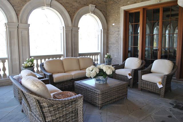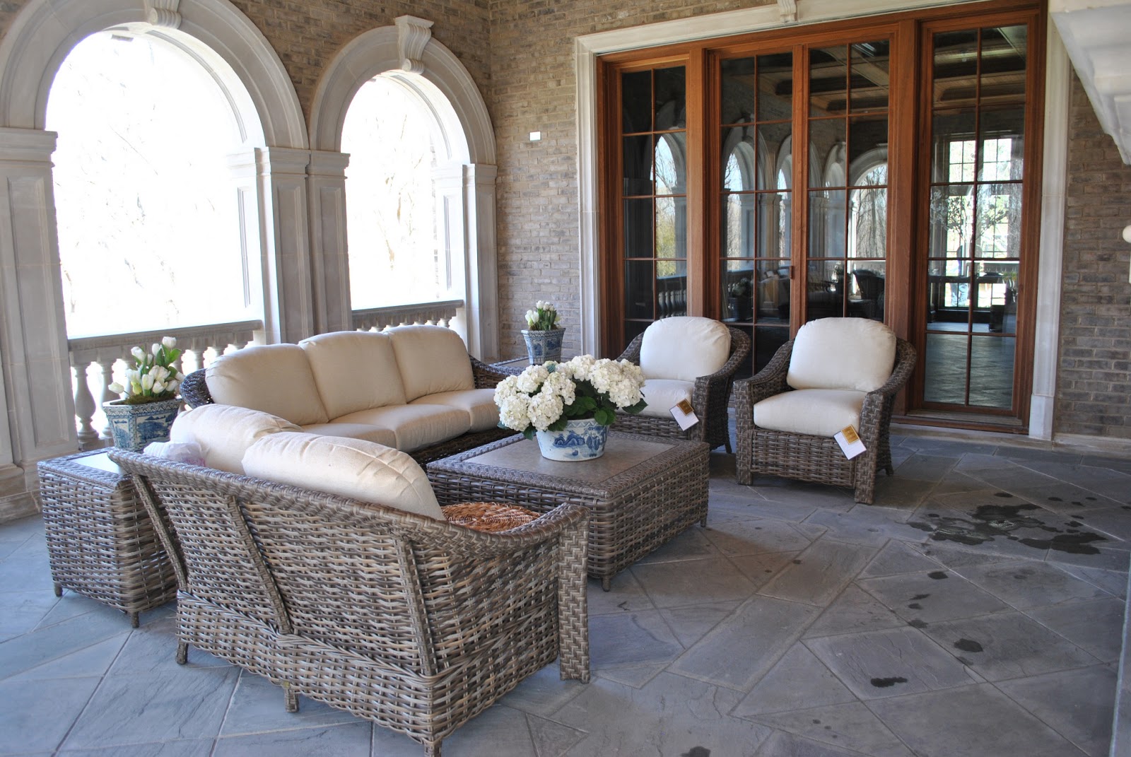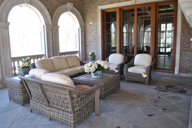 Hello and happy Wednesday evening. I just couldn’t wait to post this. OK first I want to preface this by saying this is not totally done. We had ordered lanterns but found out two weeks ago they are now out of stock until August. The search has resumed and I think we found a good one that is in stock so hopefully within the next few weeks we will have two beautiful lanterns gracing this space. Besides planters, pillows and other odds and ends, it is just about done. BUT the exciting thing is I got my outdoor furniture for the loggia. We are still short two chairs which are due in any day but I was soooo excited I just had to share! I LOVE this furniture, thank you Lane Venture for making it (you should check their website, their things are beautiful with a capital B!