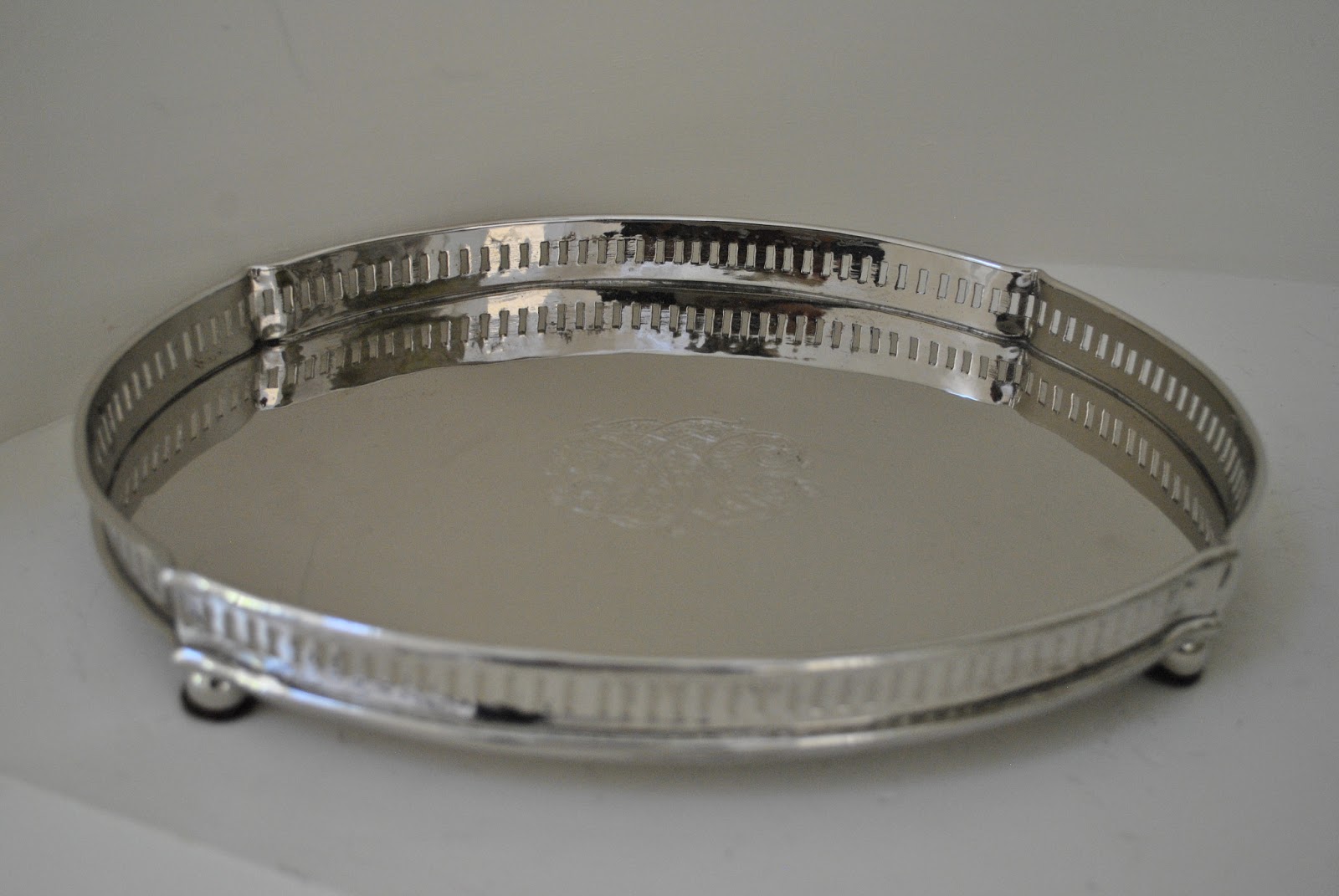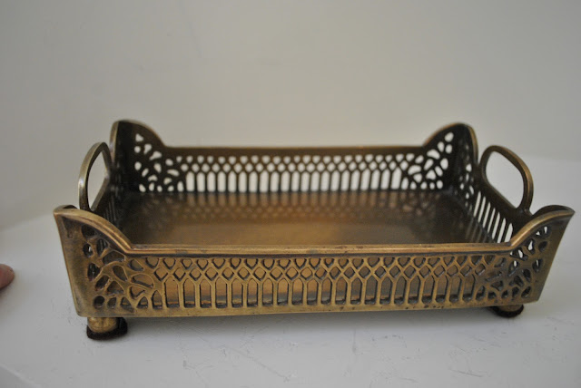 6. Beautiful crested filigree oval tray..just stunning for a bathroom, powder room or bar, about 12″ wide $90.00