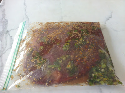 1 flank steak 1 ziplock bag about 1/2 cup soy sauce 1 bunch scallions about 4 Tbsp sesame seeds (toasted) 1 heaping Tbsp sugar about 1/4 cup oil about 1 Tbsp grated fresh ginger (if you don’t have ginger spice is OK but fresh is preferred)