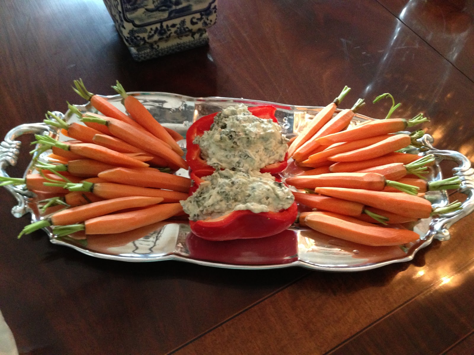 Adding my finishing touches, love the look of baby carrots and a yummy healthy spinach dip made with Greek yogurt…..
