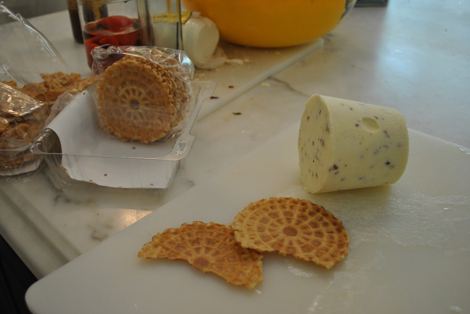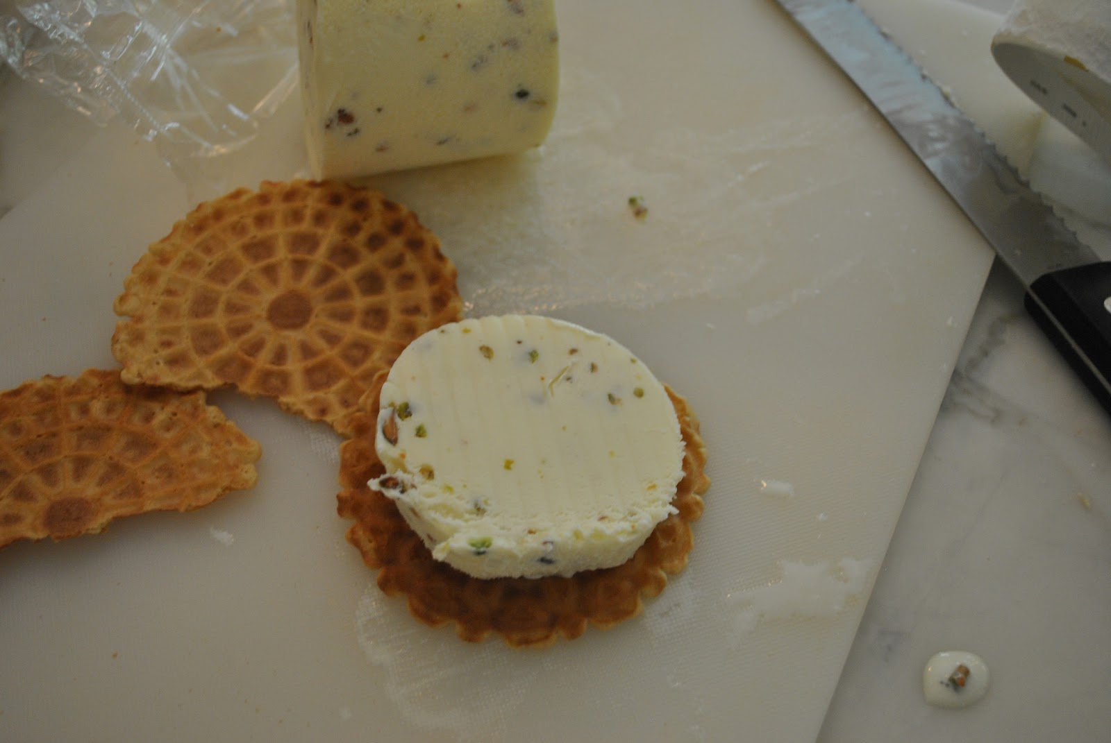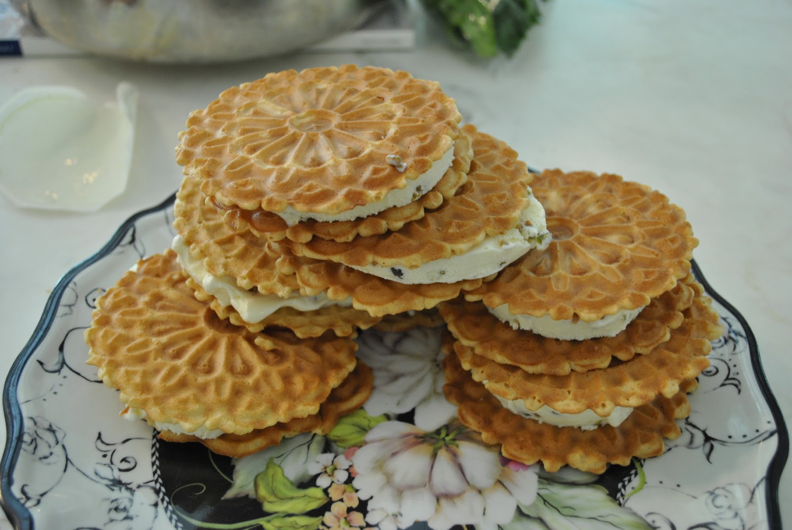 ?My delicious pistachio ice cream sandwiches. So easy and always a HUGE hit. I buy vanilla pizelles and get pistachio ice cream and open it up and then slice it, I add extra pistachios ground up…this is light, delicious, pretty and a perfect summer dessert!