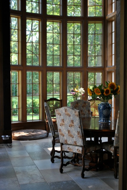 Kind of loving this first room, how decadent and rich the brown damask walls feel with miles of crown molding, and the blues and whites just totally set it off!