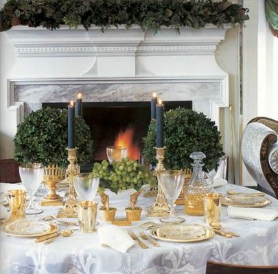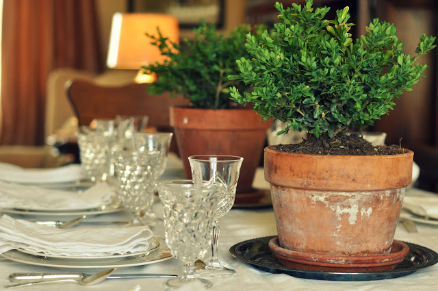 Even at a formally set table, a simple boxwood in a terra cotta planter is always elegantly understated