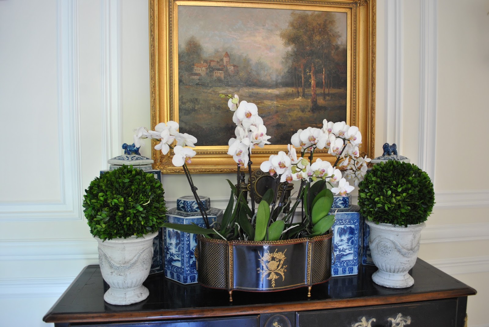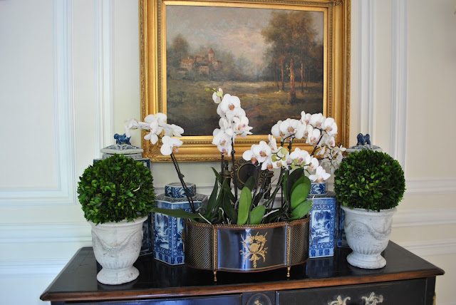 Loved the topiaries next to your blue and white vase on the table with the mirror. Also, really adore the boxwood wreaths. Beautiful!! Debbie S.