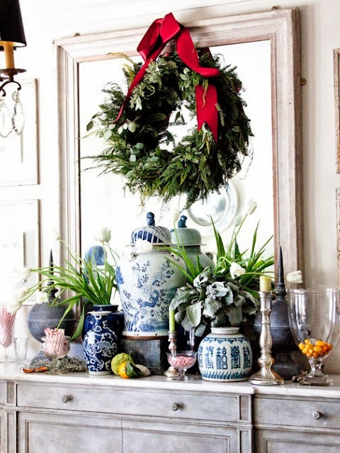 The holidays are a brilliant time to display blue and white with holiday greenery