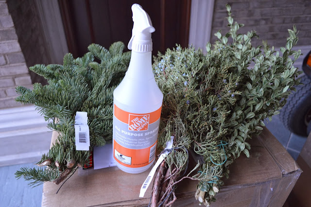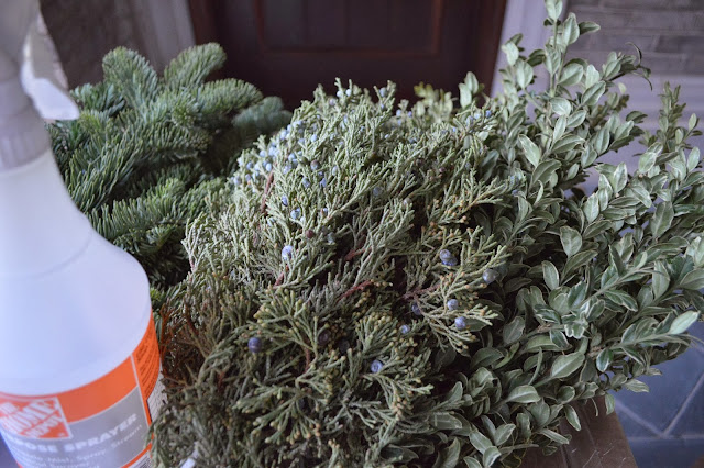 Lots of fresh evergreen (sprigs, scraps or garland that you can cut up) You can get them at not only obvious places like a nursery but your local supermarket and Home Depot for rock bottom prices