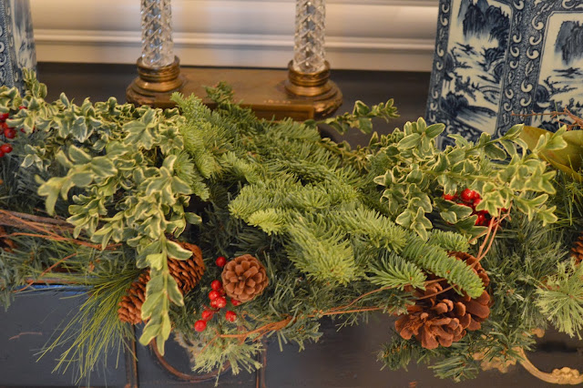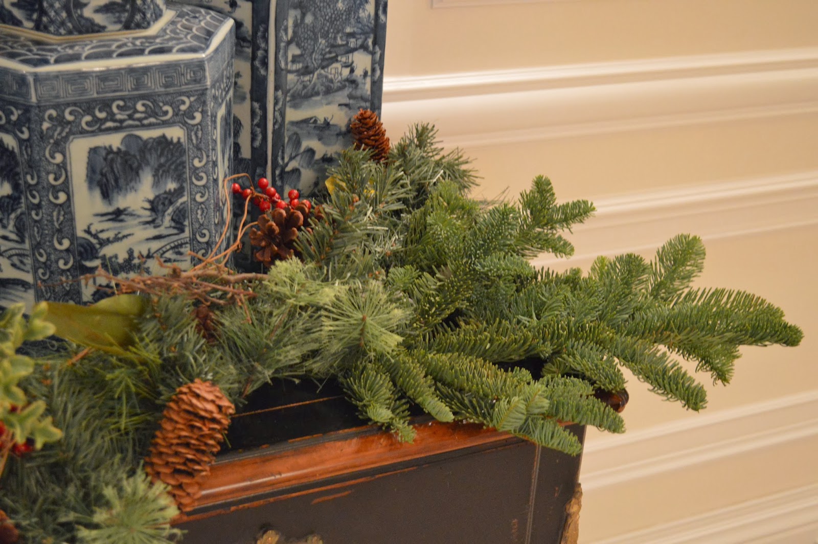 BEFORE I like adding garlands to tables/consoles, also on top of mirrors. This is a faux garland I bought I believe at Michaels years ago (have many of these). It is pretty but I like to “jazz it up” and it can be done so easily it’s not even funny, all I do is add sprigs of fresh greens to the center and sides, add a few pinecones and the makeover s complete!