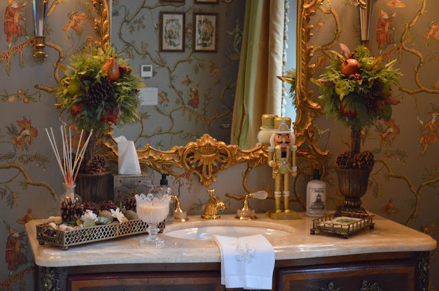 And to my main powder room, I add these pretty topiaries every year and added a gold nutcracker as well….