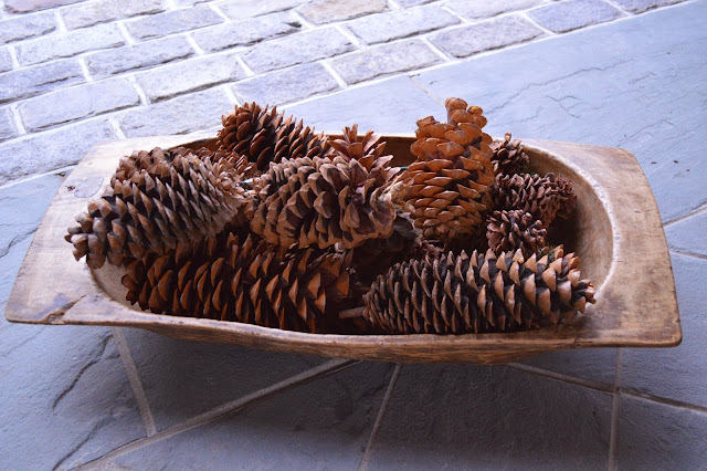 Fill a container (in this case used my antique dough bowl) with big oversized pinecones