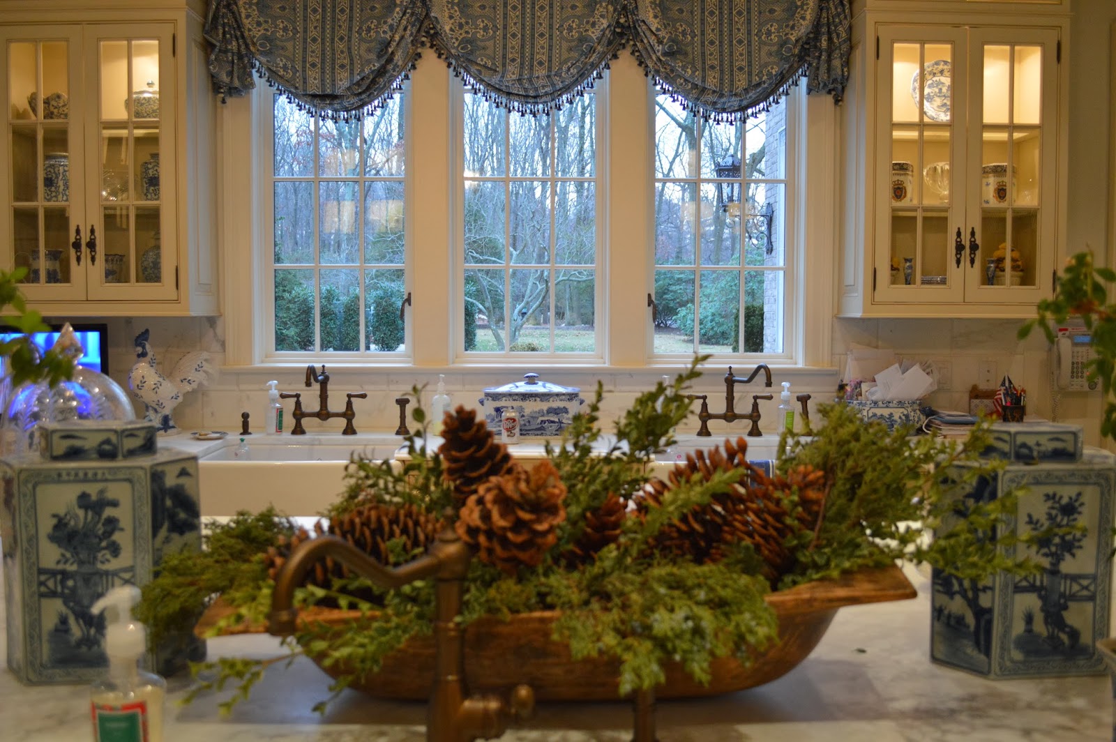 OK so with those things beyond what else you like to use for the holidays, you can indeed create a very festive feeling home. I always like to burn a candle in my kitchen (where we always are) and keep the principle rooms in my home feeling festive. A wreath on a kitchen window is gorgeous, or a center island with a pretty evergreen and pinceone display. I love adding pretty touches to a powder room like a small wreath hanging over a mirror, burning a holiday candle or adding small sprigs of everygreen to an existing display (like soaps or potpourri).