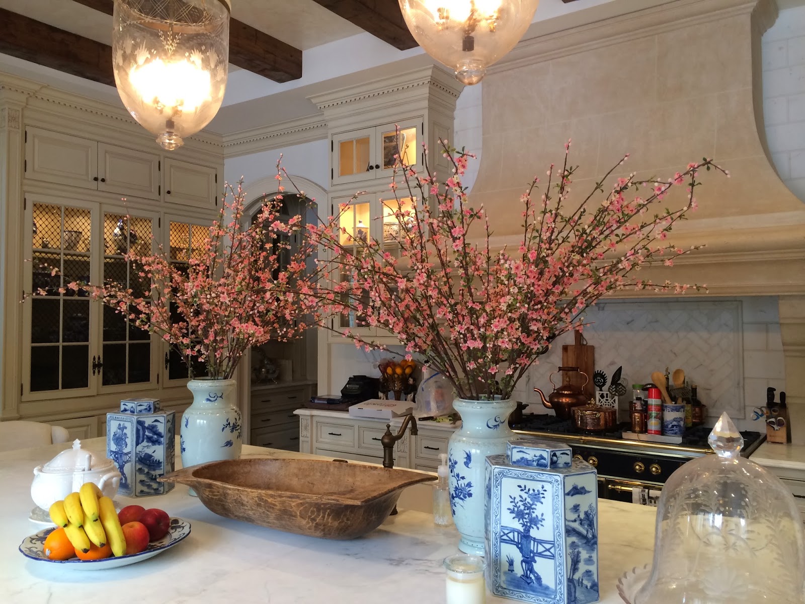 Tina, OMG your bedroom makes me want to invite myself over! I love what i am seeing so far. And the dining room papers going to be amazing, and love the console with white ginger jars and of course love the blossoms and blue and whites on your island…oh well I love it all! Just beautiful. I got my tote and LOVE it. Its fast become my every day bag. Its great! Thank you and hope you stay warm.