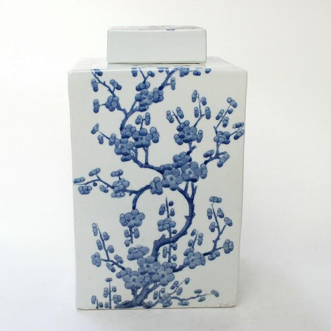 ITEM 26. A more modern take on the ginger jar, this beautiful square cherry blossom jar is a beauty. Measures 13.5″ x 7.5″ $85.00