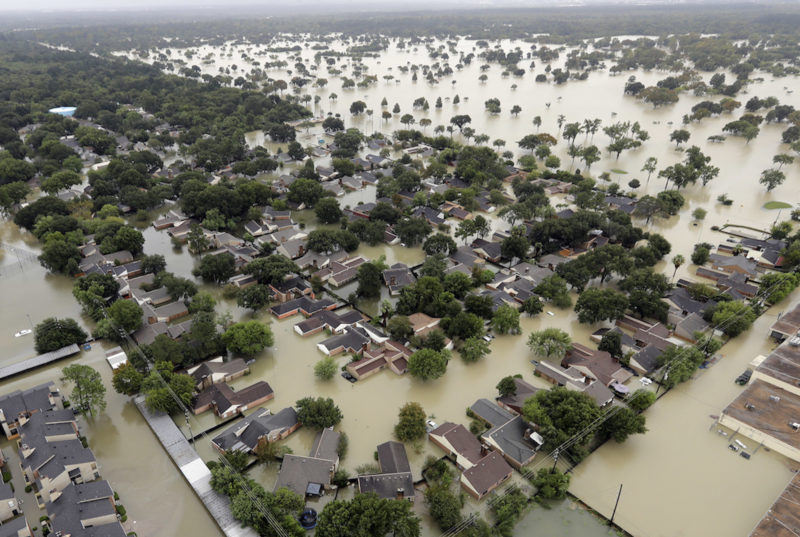 In this aerial photo, a neighborhood near Addicks Reservoir are flooded by rain from Tropical Storm Harvey Tuesday, Aug. 29, 2017, in Houston. (AP Photo/David J. Phillip)