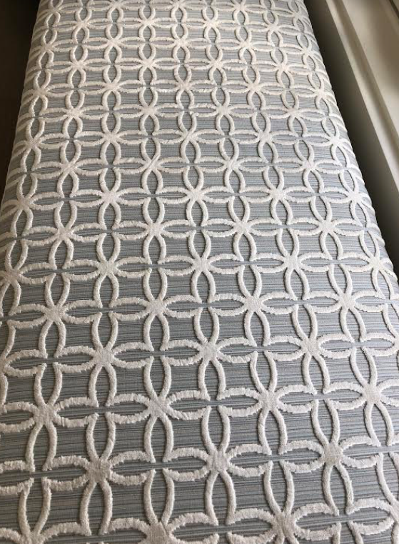 Had this beautiful trestle bench made (fabric from Stark) beautiful nickel lanterns from Circa Lighting