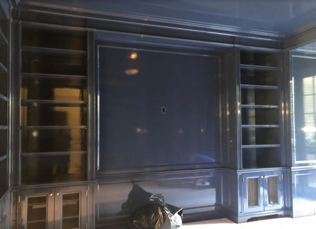 The library is incredible….I would love to duplicate this very room. The Stanton carpet just got put in and the navy blue lacquered walls are to die for