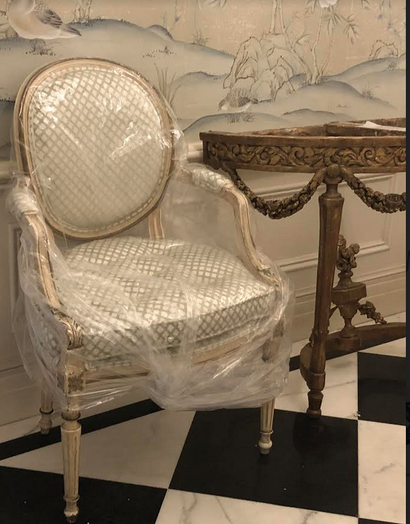 In love with the fabulous Paul Montgomery chinoiserie panels and newly reupholstered French chairs for foyer