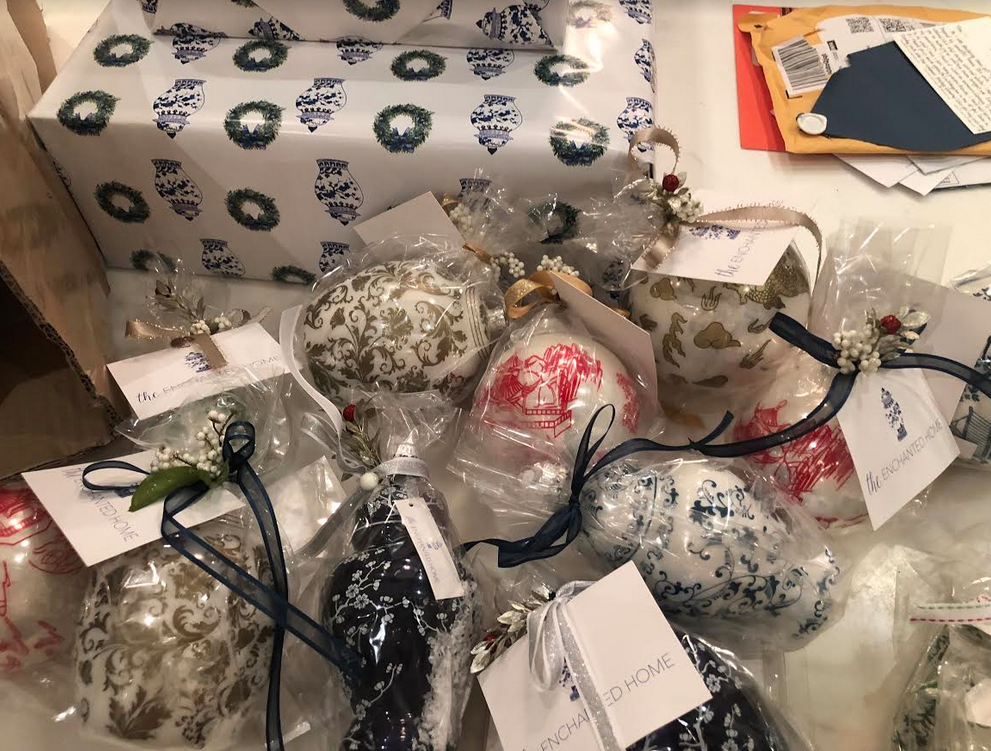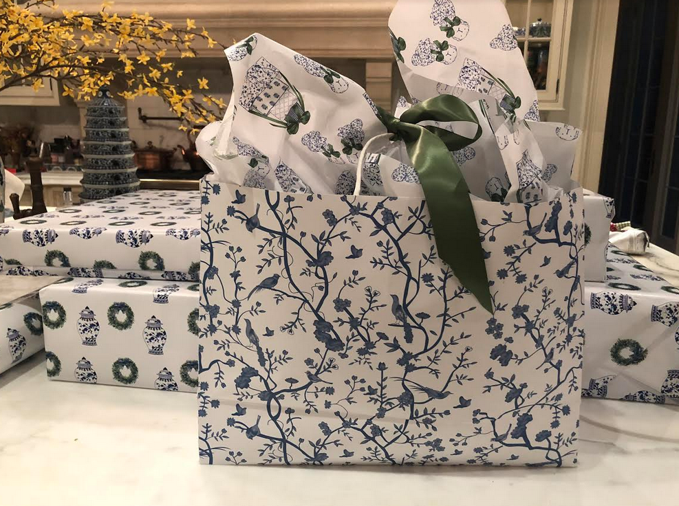 Gifts going out the door, love my Staffordshire dog and gift paper with the chinoiserie bags, a beautiful match:)