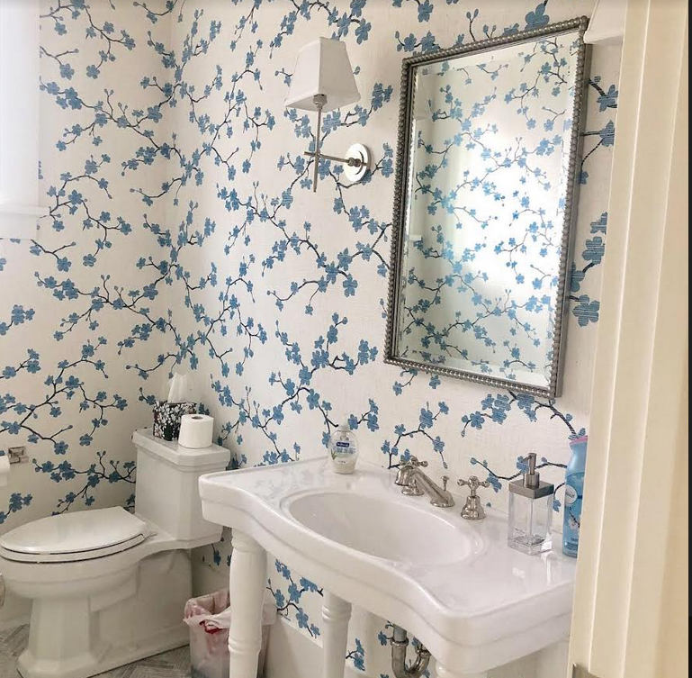 Who makes the beautiful blue and white cherry blossom grass cloth wallpaper used in one of your bathrooms?