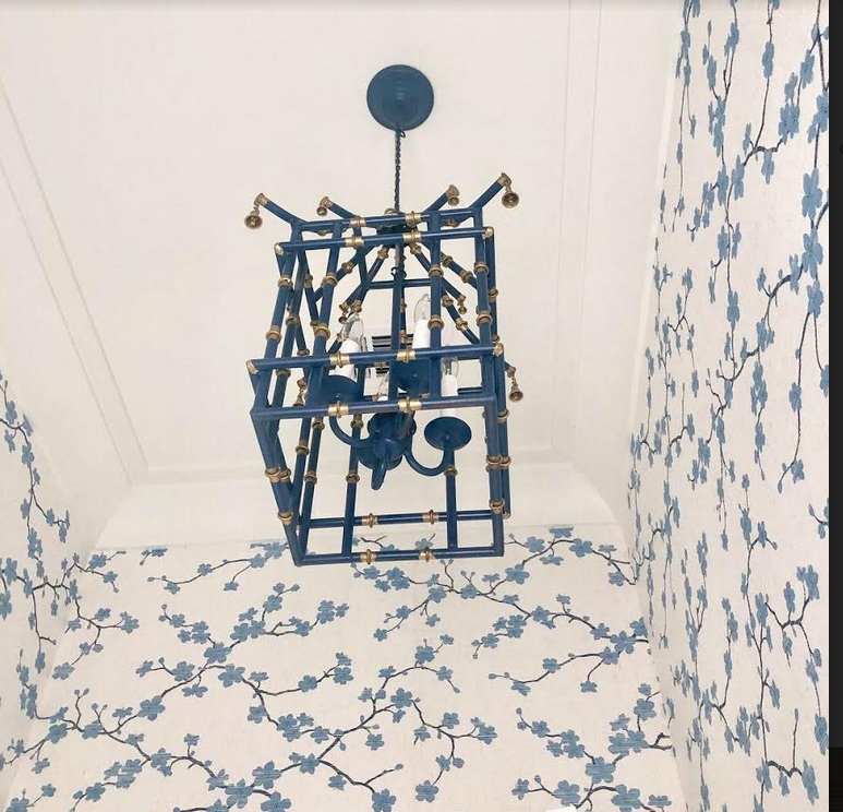 Love this powder room in the cherry blossom grass cloth and finally had a place to use my navy bamboo lantern!