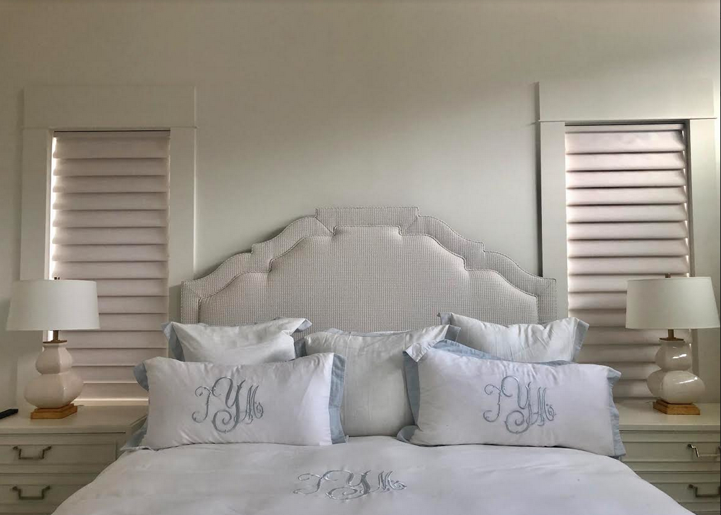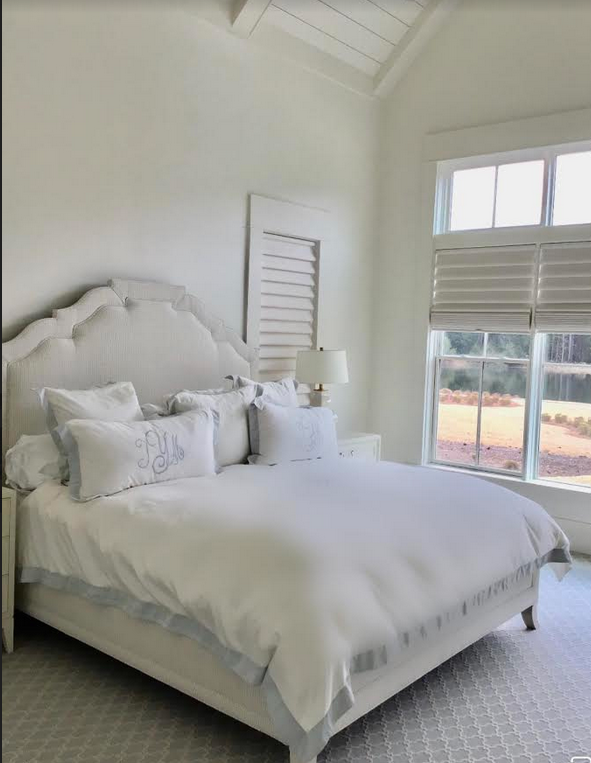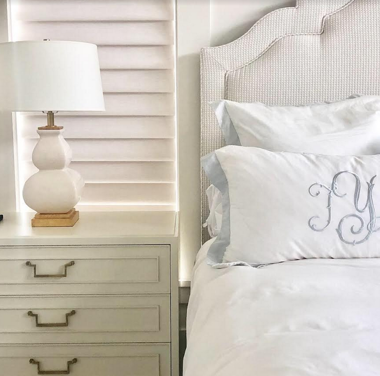 Monogrammed bedding is a must! Now looking for a printed small accent pillow which I will also use on an upholstered chair for this room