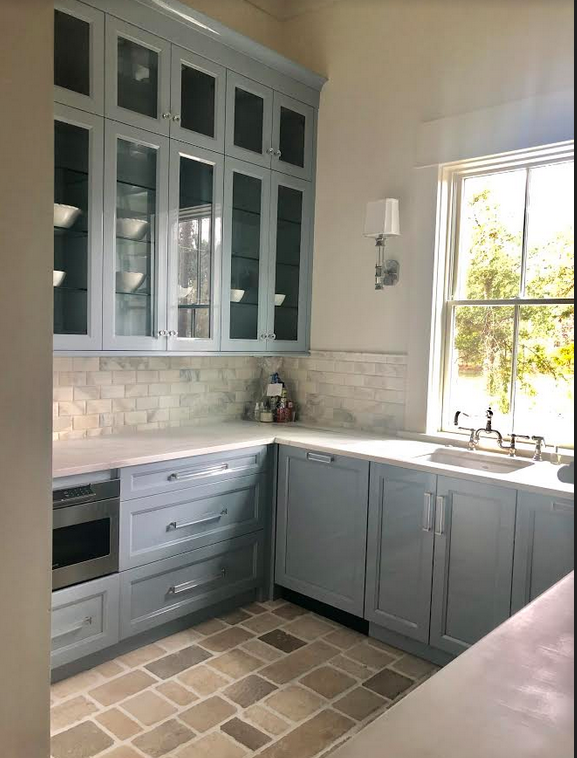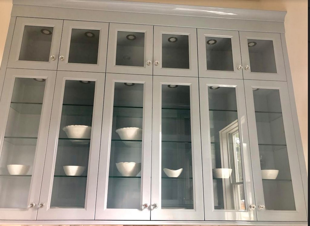 Really love my back kitchen- done in a soft blue lacquer just love this space. Decided on an all white display for the far wall of glass cabinets. Still have plenty more to get but this is a start.