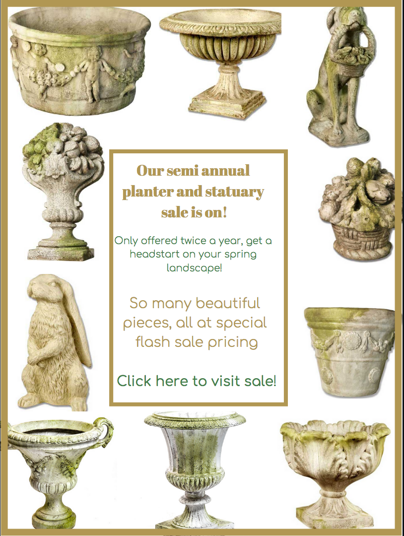PS Our spectacular semi annual flash sale on statuary and planters has started as of Wed morning! Click here to see all the beautiful planters and statuary pieces-