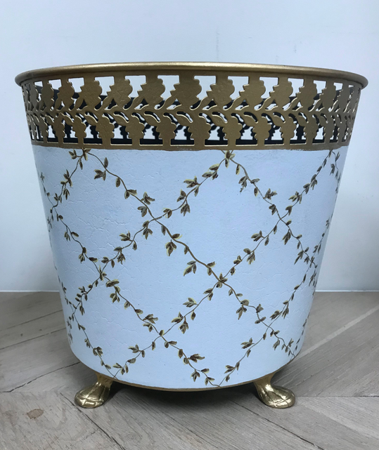 12A SOLD Last of this fabulous pale blue/trellis tole handpainted planter with gorgeous pierced metal border. I love this piece and own it. Perfect for florals or an elegant orchid. One left in the pale blue and one left in the black, measures $85.00