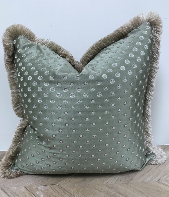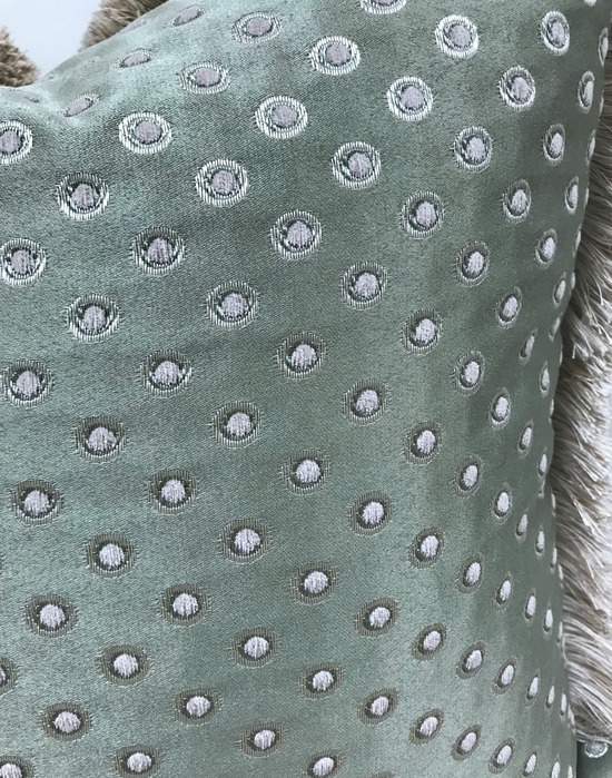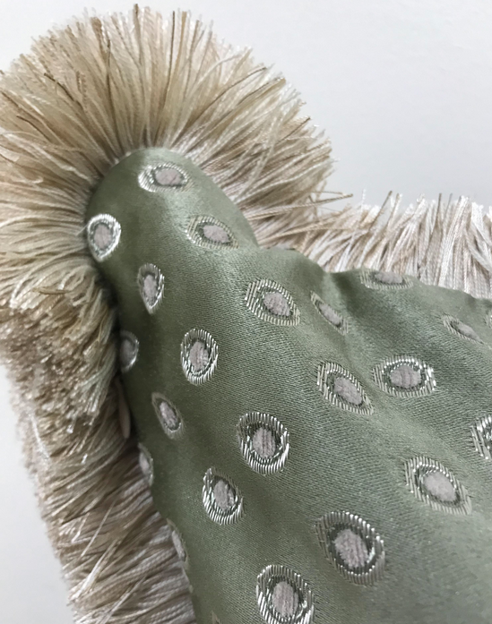 ITEM 15 One of this beautiful green/soft gray and silver pillow. Features a beautiful Kravet fabric and an elegant brushed fringe. Measures 20″ x 20″ and includes the plush down insert. $90.00